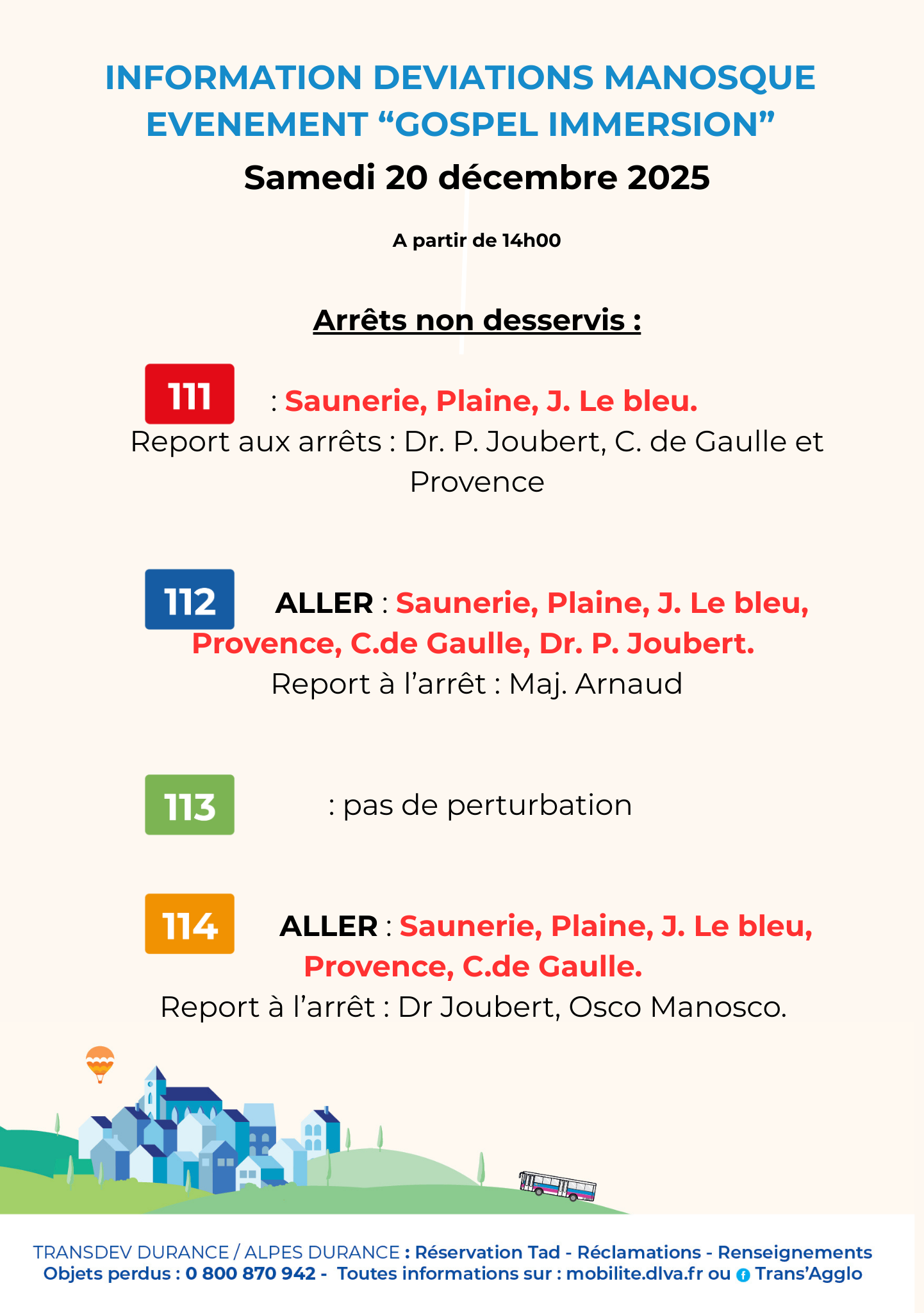 À l’occasion du concert » A Gospel Immersion » le samedi 20 décembre, une déviation de nos lignes urbaines est nécessaire.