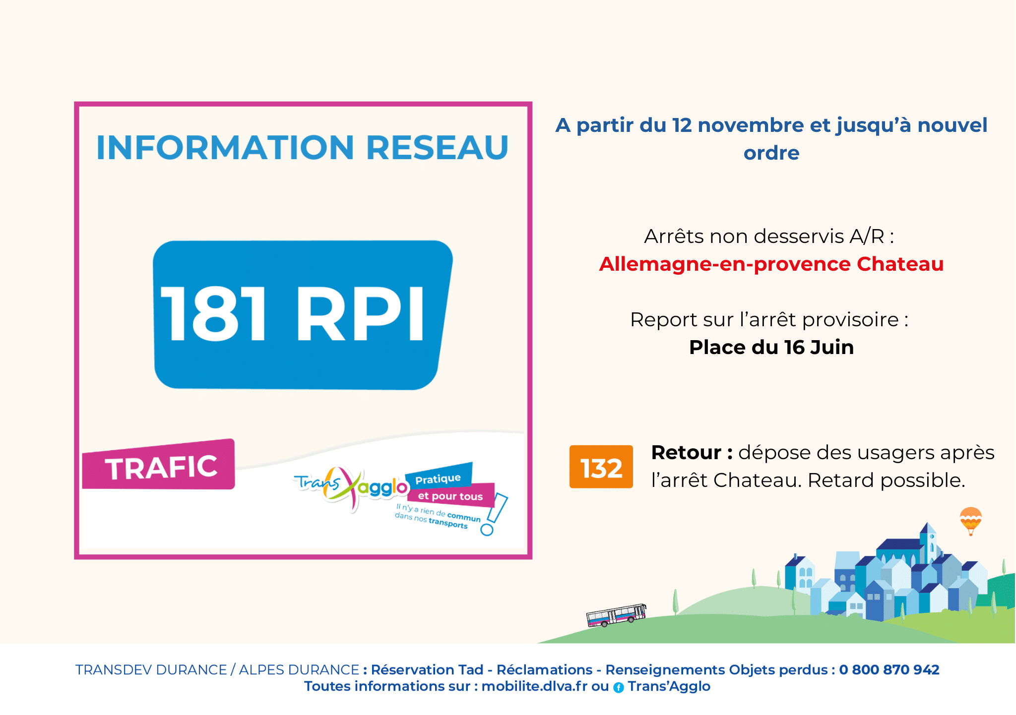 Perturbations Travaux – L181 Allemagne – en – Provence 12 novembre 2025 Actualités Plus d’informations Service Mobilité04 92 70 34 00